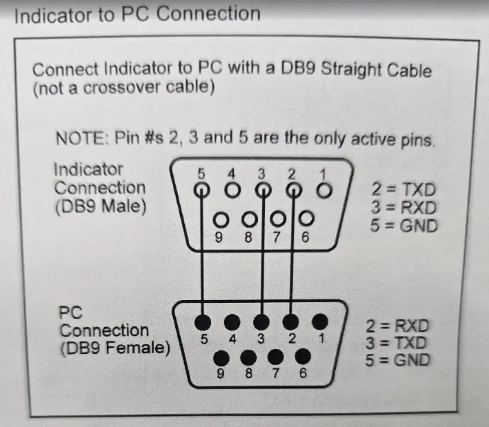 Above is the most common connection for the DB serial cable from a scale sending data out to a PC or computer nearby that would be capturing the weight values digitally and tying it into a weight ticket or database
